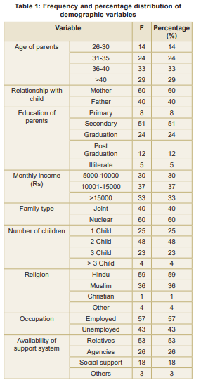 One hundred parents of intellectually disabled children constituted the study population and it was set in the selected special school of Anand district (Gujarat). Non-probability, convenient sampling technique was adopted.