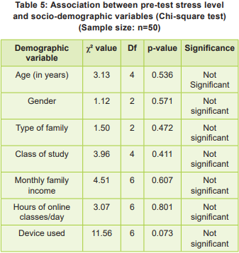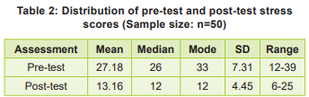 Data were analysed using SPSS version 26.0. Descriptive statistics summarised demographic and stress data. A paired t-test compared pre-/ post-intervention scores, and a chi-square test examined associations with demographics. Statistical significance was set at p<0.05.