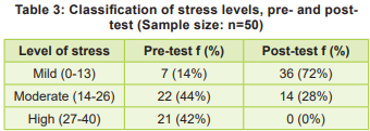 The frequency and percentage distribution of socio-demographic variables, distribution of pre- and post-test stress scores, classification of stress levels, effectiveness of art therapy on stress, effect of art therapy on stress levels, and association between pre-test stress level and socio-demographic variables are presented in Tables 1-5 and Fig 1.