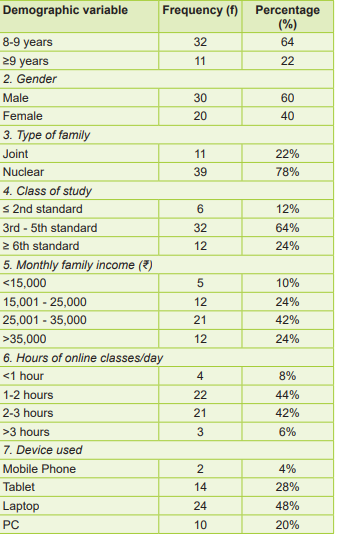 The study population comprised school-age children (6-12 years) attending online classes in the selected community area. A convenience sampling method was used to recruit 50 participants who met the inclusion criteria.