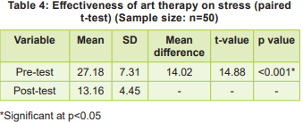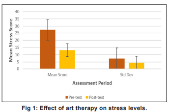 The study revealed a significant stress reduction following a seven-day art therapy intervention. The pre-test means stress score of 27.18 (SD±7.31), indicating moderate-to-high stress, decreased substantially to 13.16 (SD±4.45) post-intervention. This represents a clinically significant shift to the mild stress category for most participants, with a mean difference of 14.02 points. The 51.6 percent reduction demonstrates substantial effectiveness, a finding highly statistically significant (p<0.001) and aligned with international research.