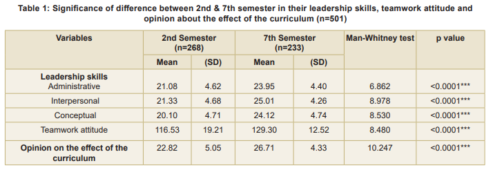 The 7th semester students showed a highly significant (p<0.0001) improvement in leadership skills (Administrative, Interpersonal & conceptual), teamwork attitude and opinion about the effect of curriculum in developing leadership than 2nd semester students (Table 1). It shows that the current undergraduate nursing curriculum is effective in developing leadership skills and teamwork attitude among nursing students.