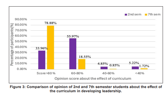 As for the opinion of students about the effect of the curriculum in developing leadership skills, a great majority (78.55%) of 7th semester students reported that it is highly effective (> 80% score) in developing leadership skills, whereas only 48 percent of 2nd semester students reported that it is highly effective (Fig 3).