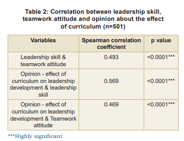 Table 2 illustrates that there was a significant positive correlation between (a) leadership skill and teamwork attitude, (b) opinion on effect of curriculum on leadership development, and leadership skill, (c) opinion on effect of curriculum on leadership development & teamwork attitude with p value <0.0001.