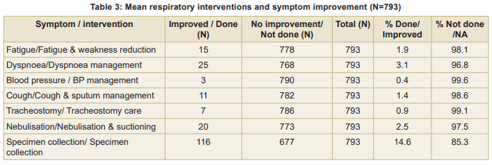 Table 3 shows that the most commonly performed intervention was specimen collection (14.6%), with a corresponding improvement in outcome. Other interventions, such as dyspnoea management and fatigue reduction, were less frequent (<5%) and showed minimal improvement in symptoms. Interventions like blood pressure management, tracheostomy care, and nebulisation were rarely performed (<3%). In the majority of patients no intervention was needed, hence no improvement.