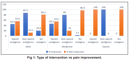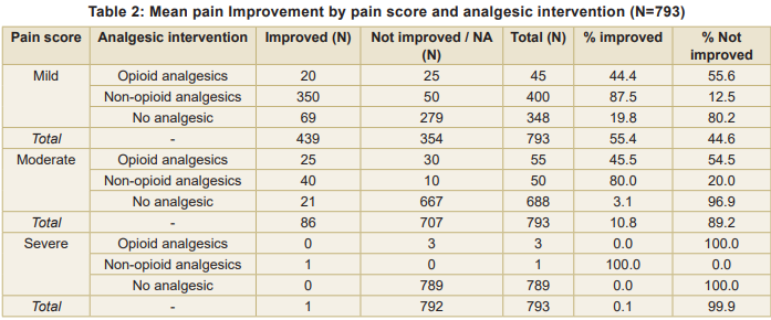 Mean pain improvement by pain score and analgesic intervention shows that in mild pain, non-opioid analgesics were most effective (87.5% improved), opioids moderately effective (44.4%), and improvement without analgesics was low (19.8%). Overall, 55.4 percent of patients improved. In moderate pain non-opioid analgesics led to 80 percent improvement, opioids 45.5 percent, and only 3.1 percent improved without analgesics. Overall improvement was 10.8 percent. In severe pain, most patients (789/793) received no analgesics and did not improve. A very small number received opioids (0% improved) or non-opioids (100% improved, n=1). Overall improvement was 0.1 percent. Chi-square analysis confirmed a highly significant association between type of analgesic intervention and pain improvement (χ² = 1,442.07, df = 2, p < 0.001). Non-opioid analgesics were highly effective in mild and moderate pain, while severe pain remains largely untreated, highlighting a critical gap in pain management (Table 2).