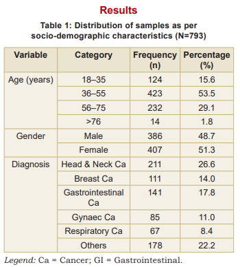 This study included 793 adult patients who attended the specialist palliative care OPD. The mean age of participants spanned a wide adult range, with the majority (53.5%) aged 36-55 years (Table 1). Patients aged 18-35 years accounted for 15.6 percent, those aged 56–75 years for 29.1 percent, and patients above 76 years constituted 1.8 percent of the cohort. Gender distribution was nearly balanced, with 407 females (51.3%) and 386 males (48.7%). Regarding diagnosis, the most common cancers were head and neck (26.6%), gastrointestinal (17.8%), and breast cancer (14.0%). Gynaecological cancers accounted for 11.0 percent, respiratory cancers for 8.4 percent, and other malignancies constituted 22.2 percent of cases.