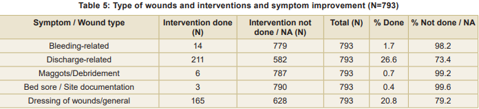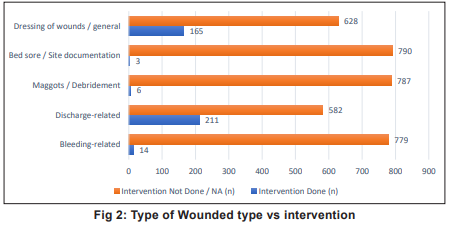 The distribution of wound-related interventions showed that certain wound types were more likely to receive nursing care than others (Table 5). Discharge-related wounds were the most commonly managed (26.6%), indicating a high prevalence and priority for intervention in the OPD setting. General wound dressings were documented in 20.8 percent patients highlighting the routine nature of dressing care as a nursing responsibility. Bleeding-related wounds were addressed in 1.7 percent cases reflecting either lower occurrence or selective intervention. Maggot-infested wounds (debridement) were rarely documented (0.7%), suggesting fewer cases or referral for specialised wound care. Bed sores - least frequent (0.4%), possibly due to in-patient management or preventive measures limiting their occurrence in OPD patients. Chi-square analysis showed a highly significant association between wound type and intervention (χ² = 573.47, p < 0.001). This indicates that common wound types (dischargerelated, general dressings) were substantially more likely to receive intervention compared to less frequent wound conditions (maggots, bleeding, bed sores).