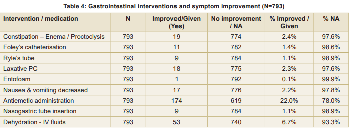 Mean gastrointestinal interventions and symptom improvement, the elimination needs and constipation management are shown in Table 4. Improvement rates were low for enema/proctoclysis (2.4%), Foley’s catheterisation (1.4%), Ryle’s tube (1.1%), Laxative PC (2.3%), and Entofoam (0.1%). Decrease in symptoms of nausea and vomiting was observed in 2.2 percent, whereas antiemetic administration was given in 22 percent of patients, reflecting preventive or therapeutic intervention. In dehydration management fluids led to symptom improvement in 6.7 percent of patients, and nasogastric tube insertion improved symptoms in 1.1 percent. Majority of patients (>90%) did not experience measurable short-term improvement in gastrointestinal symptoms.