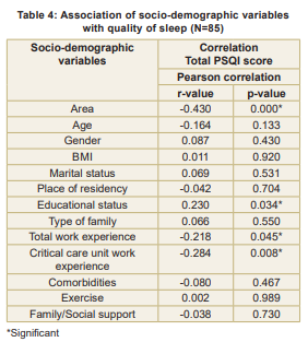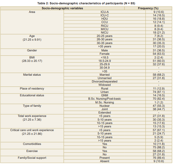 Sample size: 85 Nursing Officers from critical care units were included in the study. The sample size was calculated based on the anticipated 67 percent of nursing officers who reported poor quality of sleep. In an earlier study assuming a 95 percent confidence interval and 10 percent permissible error, the sample size was calculated using the Cochran formula (Zhou et al, 2023).