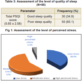 This study assessed sleep quality and perceived stress of the participants using the PSQI and PSS-10. Socio-demographic characteristics of participants is in Table 2. It was found that 65.1 percent of participants had poor sleep quality, while 34.9 percent reported good sleep (Table 3). Among 85 participants, 38.4 percent experienced low stress, 57.0 percent moderate stress, and 3.5 percent high stress, suggesting that most participants managed stress effectively (Fig 1).