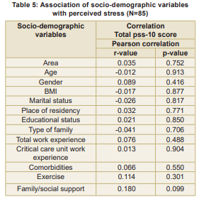 Similarly, perceived stress showed no significant associations with socio-demographic factors such as age, gender, BMI, marital status, work experience or family support (p > 0.05). Mean scores for PSQI and PSS-10 were 5.65 (SD =2.59) and 14.99 (SD = 5.99), respectively. A moderate positive correlation was found between perceived stress and sleep quality (r = 0.314, p = 0.003), indicating that higher stress levels are linked to poorer sleep quality. The findings highlight
