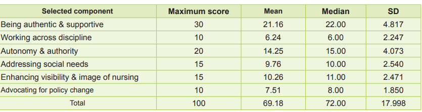 The maximum scores of opinions on selected components of futuristic nursing, i.e., being authentic and supportive, working across disciplines, autonomy/authority, addressing social needs, efforts to enhance nursing’s visibility and image, and advocating for policy change were 30, 10, 20, 15, 15 and 10 respectively. The obtained mean opinion score was 69.18 ± 17.998.