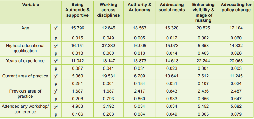 Raso et al (2012) showed that during a pandemic year when nurse leaders rose to meet frontline leadership needs, there was a significant association between years of experience and interdisciplinary collaboration, autonomy/ authority in practice, addressing social needs, advocating for efforts to enhance nursing’s visibility and image and policy change (p <0.05). Sample opined that addressing the social determinants of patient health such as housing, education, income and environmental factors shall be the focus of nursing leaders. The association between years of experience and the ability to be authentic and supportive was statistically not significant. There was a statistically significant association (p<0.05) between the current area of practice and working across disciplines, addressing social needs, and advocating for policy change. There was a statistically significant association (p=0.049) between attending any workshop/ conference and addressing social needs indicating that nursing professionals require sustained reinforcement of various components of futuristic nursing. Capacity building on the components would enlighten the vision of nursing professionals in futuristic nursing.
