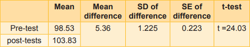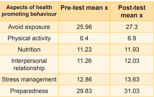 In the post-test, 16 (53.3%) of the rural elderly had moderate health-promoting behaviour, 14 (46.6%) had positive health-promoting behaviour, and none had negative health-promoting behaviour. Table 1 reveals that in overall aspects of healthpromoting behaviour, the post-test mean is greater than the pre-test mean.
