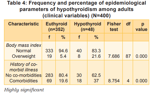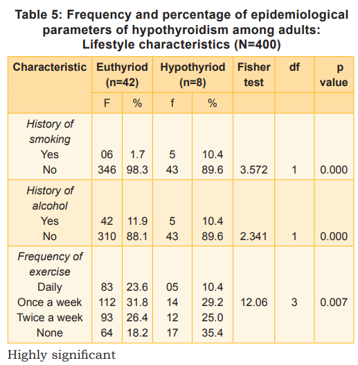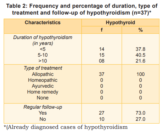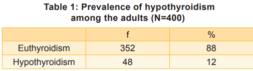 Prevalence of hypothyroidism, frequency and percentage of duration, type of treatment and follow-up of hypothyroidism, epidemiological parameters of hypothyroidism, and epidemiological parameters of hypothyroidism among the adults have been shown in Tables 1-6.