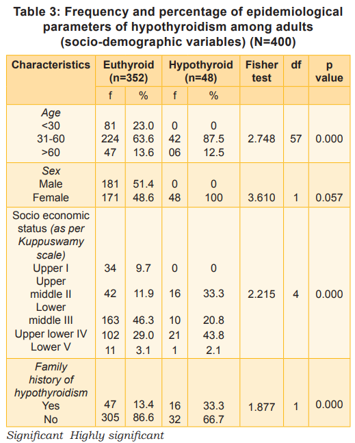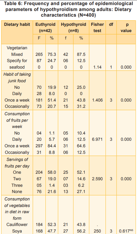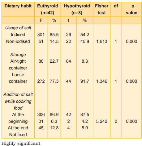 The results of the study showed that out of the total (400) subjects, 352 (88%) were found to be euthyroid, and 48 (12%) suffering from hypothyroidism. The maximum adults (n=42, 87.5%) were found to be vegetarian, 21 (43.8%) adults were found with a habit of taking junk food in their diet, followed by 15 (31.2%) taking it occasionally. Regarding consumption of fruits, the majority (n=31, 64.6%) were found taking fruits in their diet. Regarding vegetables, 27 adults (56.2%) found consuming soya in their diet. As for usage of salt, the majority (n=44, 91.7%) were found using iodised salt, yet a maximum number of subjects (n=42, 87.5%) had the habit of storing salt in a loose container and adding salt while cooking in the beginning. The variable consumption of vegetables was found to be non-significant at p value 0.05, which is 0.617 whereas all others were highly significant.