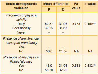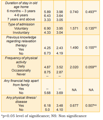 Most of the elderly were in the age group of 60-70 years. Out of 19, 13 were male, 8 elderlies had completed only secondary education. Nine were widow and duration of stay in old age home ranged between 6 months to 3 years; 11 elderlies belonged to nuclear families and were having no source of income. More than half (10) elderlies came voluntarily to stay in old age home. Almost every one (15) did physical activity daily; 11 elderlies had physical illness.