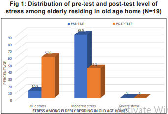 During pre-test majority (n=17) of the elderly fall in moderate level of stress category, and only 2 elderly had mild level of stress (Fig 1). After the intervention, the strength in mild level of stress increased to 11 and only 8 remained in moderate