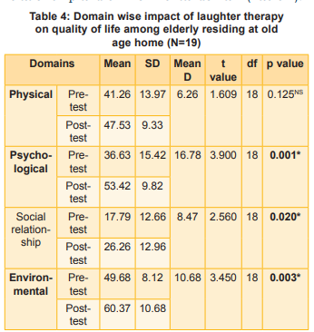 The computed ‘t’ value and ‘p’ value have a significant difference between the pre-test and post-test quality of life score of psychological, social relationship and environmental domain (Table 4).