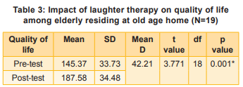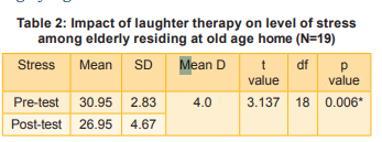 Impact of laughter therapy: This study has revealed that laughter therapy had significant impact on both, level of stress and quality of life with p-value 0.006 and 0.001 respectively.