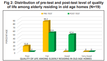 level. Fig 2. depicts that 84.2 percent of elderly had fair quality of life whereas 15.8 percent had poor quality of life; none had good and very good quality of life in the pre-test. After the intervention 47.5 percent came in good quality of life category and 52.65 in fair category. Table 2 depicts that there is markable difference between pre-test and post-test level of stress with the laughter therapy so it indicates high effectiveness in reducing stress level. Table 3 shows impact of laughter therapy pre-test and post-valves regarding quality of life measurement, as it have ‘p’ value of 0.00 1 that is highly significant.