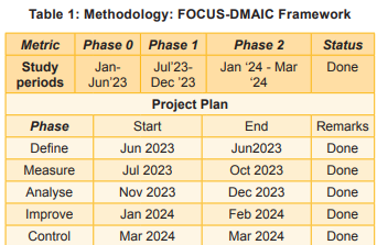 Project design: The QIP utilised the FOCUS-DMAIC framework to systematically address the issue of MARSI. This structured approach facilitated clear identification of objectives, measurement of baseline data, and implementation of targetted interventions. The timeline of DMAIC is shown in Table 1.