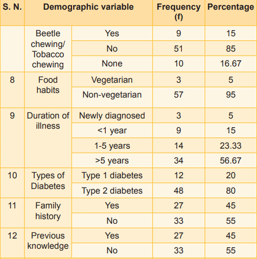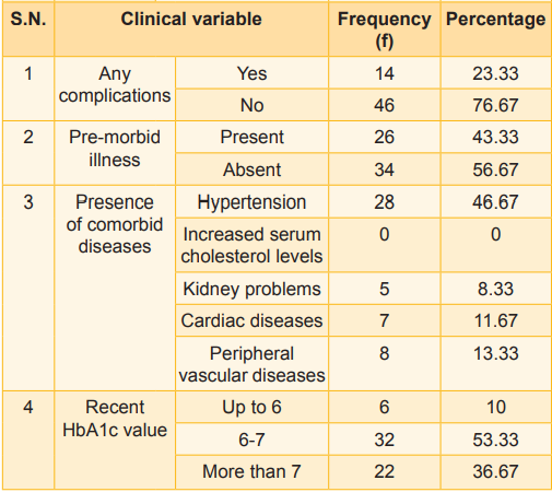 Similar to a study in Haryana (India) by Verma et al (2012), around half of our study participants had a family history of diabetes (45%). In the present study, almost three-fourths of the diabetics are taking treatment for a comorbidity or a chronic disease; 43.33 percent participants had health problems other than diabetes (Deribe et al, 2014). Hypertension was the most common comorbidity in our study. In a multicentre study in India, hypertension among diabetics was found to be 34 percent (Viswanathan et al, 2005).