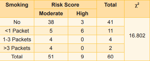 Table 7, ?2 value as 16.802 was significant showing that there was an association between smoking habits and the level of risk for the development of diabetic foot ulcer.