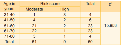 Table 5 depicts the rank correlation between total risk and its factors for developing diabetic foot ulcer. Correlation value of limitation of mobility was 0.0445, vascular changes was 0.060, sensation of feet was 0.050, skin conditions was 0.034, structural deformities was 0.025, diabetic neuropathy was 0.055, and footwear practices were 0.0001. The item total correlation is significant at the 0.01 level, and it was revealed that the most predominant risk factor was vascular changes, the second predominant factor was sensation of feet, whereas the last risk factor was footwear practices. In Table 6, the ?2 (15.953) was significant showing that there was an association between age and the level of risk for the development of diabetic foot ulcer.