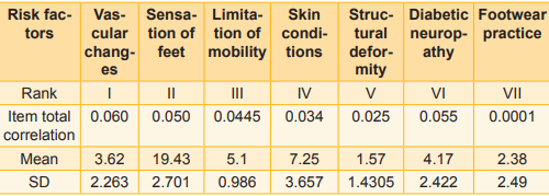The rank correlation between total risk and its factors for developing diabetic foot ulcer. Correlation value of limitation of mobility was 0.0445, vascular changes 0.060, sensation of feet 0.050, skin conditions 0.034, structural deformities 0.025, diabetic neuropathy 0.055, and footwear practices were 0.0001. The item total correlation is significant at the 0.01 level, which reveals that the most predominant risk factor was vascular changes, followed by sensation of feet, whereas the last risk factor was footwear practices.
