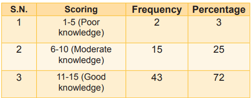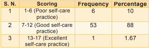 It was seen that out of 60 samples, 2 (3%) had poor knowledge, 15 (25%) had moderate knowledge, and 43 (72%) had good knowledge (Table 2). Table 3 shows that out of 60 samples, 6 (10%) had poor self-care practice, 58 (88%) had good self-care practice, and 1 (1.6%) had excellent self-care practice.