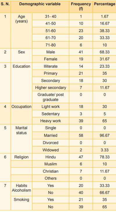 It was seen that 41 (68.33%) were males and 19 (31.67 %) females. There was one subject (1.66%) aged 31-40 years, 10 (16.67%) were in 41-50 years range, 23 (38.33%) between 51-60 years, 20 (33.33%) between 61-70 years, and 6 (10%) 71-80 years of age; 14 (23.33%) were illiterate, 21 (35%) had primary education, 18 (30%) secondary education, 7 (11.67%) higher secondary education and none with graduation/post-graduation status. Occupation: 18 (30%) were light workers, 3 (5%) sedentary workers and 39 (65%) heavy workers. Marital status: none were single, 58 (96.67%) were married; none were divorced and 2 (3.33%) were widowed (Table 1). Religion: 47 (78.33%) were Hindu, 6 (10%) Muslim and 7 (11.67%) were Christian. Habits: 20 (33.33%) consume alcohol and 40 (66.67%) do not consume alcohol; 21(35%) were smokers and 39 (65%) were non-smokers; 9 (15%) were beetle/tobacco chewers 51 (85%) had no habit of beetle/tobacco chewing. Food habits: 3 (5%) were vegetarians and 57 (95%) non-vegetarian.