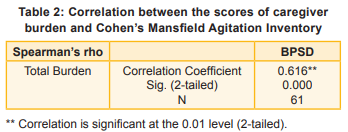 Correlation of caregiver burden with behavioural and psychological symptoms of dementia (BPSD): There was a significant positive correlation between the two parameters, indicating that as patients exhibited more and more behavioural and psychological symptoms, the caregiver burden increased (Table 2).