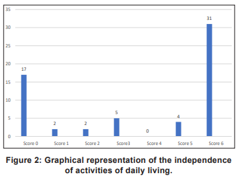 Activities of daily living (ADLS): On the Katz Index of Independence in ADLS (Graf, 2021), the mean score was 3.72 + 2.66, indicating a medium level of dependence of the patient on their caregivers for basic ADLS. 17 (27.9%) scored a zero on this scale, indicating complete dependence on the caregivers (Fig 2).