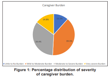 Illness-related variables: 8 (13.1%) patients had a duration of illness up to 2 years, 5 (8.2%) had a duration of 2 to 5 years, and 48 (78.7%) had a duration of illness of more than 5 years. On the Caregiver Burden scale (Zarit et al, 2018), used to assess caregiver burden, the scores ranged from 1 to 76, the mean score being 37.2 + 15.9. Of the caregivers studied, 7 (11.5%) experienced little to no burden, 24 (39.3%) experienced mild to moderate burden, 21 (34.4%) reported moderate to severe burden while 9 (14.8%) were suffering from very severe burden (Fig 1).