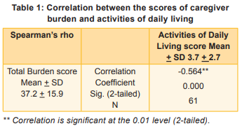 Correlation of caregiver burden with activities of daily living (ADLS): There was a significant negative correlation between the two parameters, indicating that as the scores on the activities of daily living went down, i.e. the patient became more dependent on the caregiver, their burden increased (Table 1).