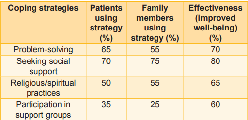 Families primarily relied on social support, with 75 percent indicating that strong familial and community support helped them manage their emotional burden. Religious and spiritual practices were also frequently used as coping mechanisms, with 55 percent of family members reporting that these practices provided comfort and hope during challenging times.