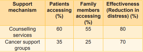Counselling and psychological support - Of the 100 participants, 60 percent of patients and 55 percent of family members had accessed counselling services. Counselling was associated with significant reductions in reported depression, with 80 percent of those who received counselling reporting improved psychological well-being (Table 4).