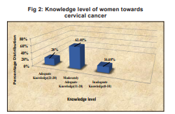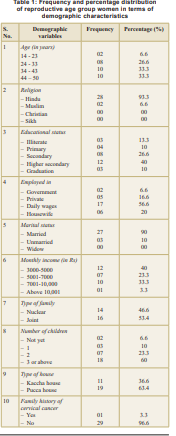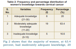 The data collected were tabulated, organised, analysed in terms of demographic variables, frequency and percentage distribution of women's knowledge towards cervical cancer and level of knowledge of women on cervical cancer through a structured questionnaire (Tables 1-3).