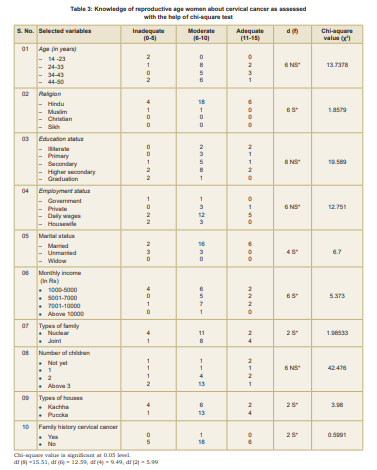 percent had adequate knowledge, and 16.6 percent had inadequate knowledge. Knowledge on Cervical cancer through a structured knowledge questionnaire association value showing the relationship of the knowledge of women in the reproductive age group in rural areas with selected factors, with the help of the chi–square test Table 3 indicates that a significant relationship exists between religion, marital status, monthly income, types of family, types of houses and family history of cervical cancer of women at reproductive age group as indicated by chi - square values of 1.8579, 6.7, 5.373, 1.98533, 3.98 and 0.5991, which is significant at 0.05 level.