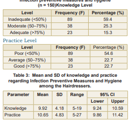 The present findings of this study reveal critical insights into the knowledge and practice related to infection prevention and hygiene among hairdressers in Nadiad city. The predominance of inadequate knowledge and poor hygiene practices among participants suggests a significant public health concern, especially in the context of services that involve close contact with clients and the potential for disease transmission. Interestingly, while the participants had a moderate mean knowledge score (9.92 ± 4.18), it did not.