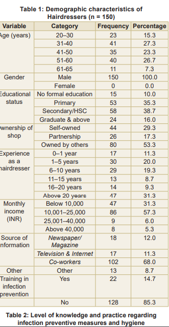 Study design and setting: A quantitative, cross-sectional survey design was employed to assess the knowledge and practices related to infection preventive measures and hygiene among hairdressers in Nadiad city (Gujarat). The study was conducted among 150 hairdressers selected from various barber shops across the city.